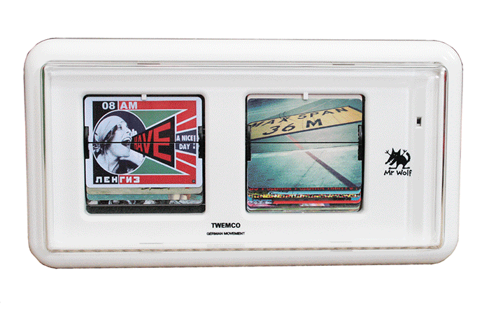 With a Model#1 clock, every minute and hour is displayed as part of a broader composition. The clock is a flip-clock, although this clock subverts the monotony with which such clocks usually represent the time. In this timepiece, the numbers are embedded in images; sometimes the number displayed might be obvious and at other times, cryptic. The cumulative effect is that of a colourful puzzle or dreamscape, in which the marking of time is made interesting and whimsical. The result is a piece that tells the time but is also something of a work of art in itself.